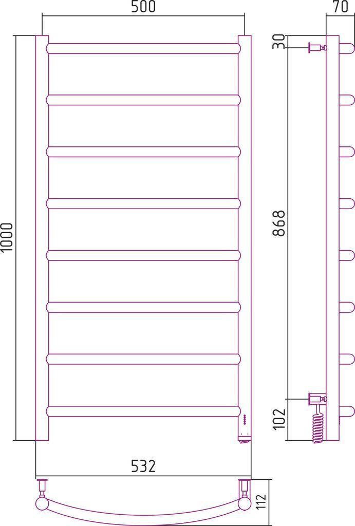 Полотенцесушитель электрический Сунержа Галант 4.0, размер 1000х532 мм, 8 перекладин. Мощность 147 Вт. Интегрированное в корпус скрытое подключение.