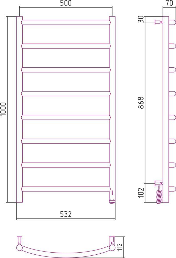 Полотенцесушитель электрический Сунержа Галант 4.0, размер 1000х532 мм, 8 перекладин. Мощность 147 Вт, цвет сатин. Интегрированное в корпус скрытое подключение.