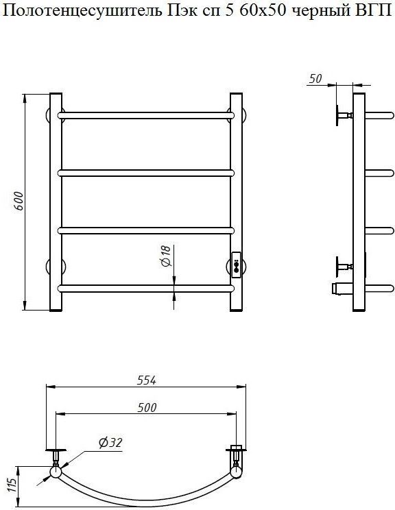 Полотенцесушитель электрический Тругор Пэк сп 5 ВГП П4 500х600 мм, чёрный (возможность скрытого подключения) 00-00035955