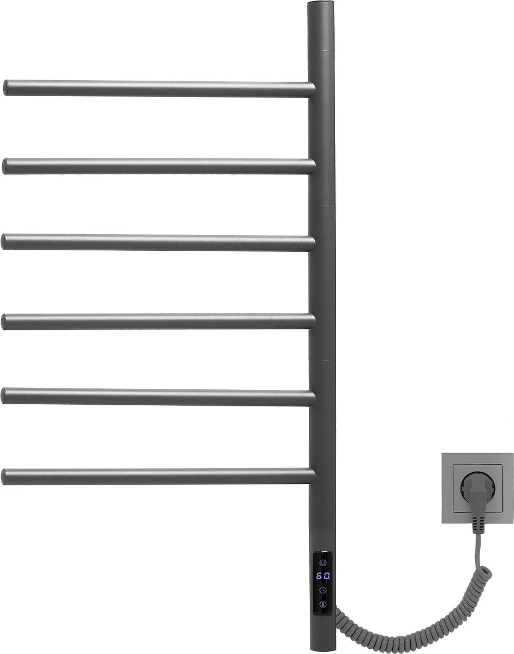 Полотенцесушитель электрический Vincea VTD-1S2CGE, размер 430x797х87 мм, 6 перекладин, мощность 65 Вт, цвет графит. Возможность скрытого подключения.