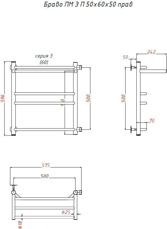 Полотенцесушитель водяной Тругор Браво3 ПМ с боковым подводом и полкой П6 500х600 мм R (м/о 500 мм) 00-00017301