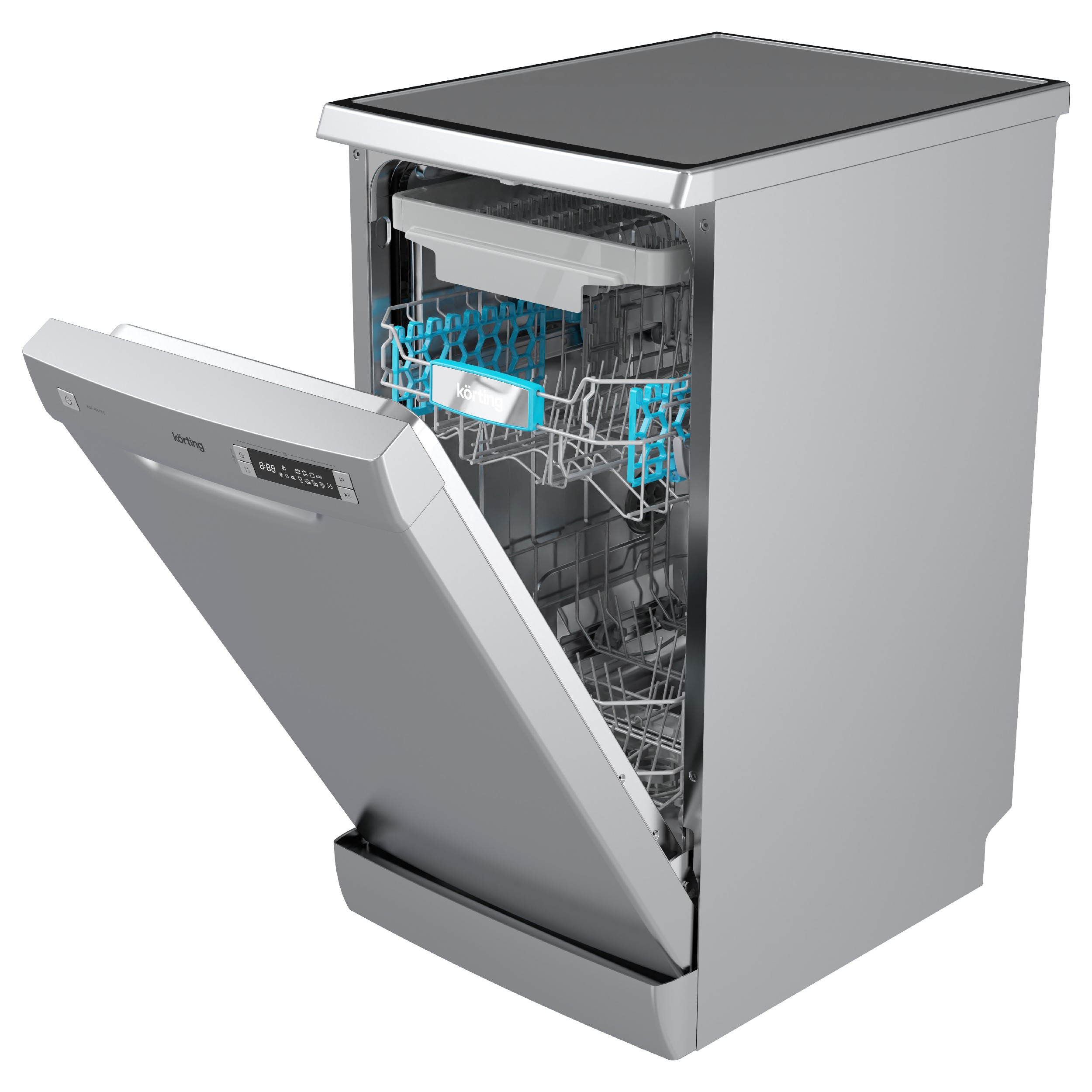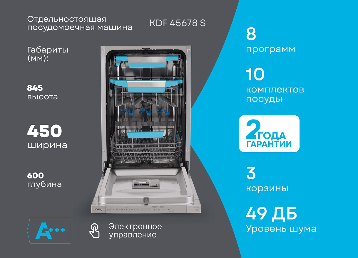 Эта модель оснащена восьмью различными программами мойки, включая стандартную, интенсивную, экономную, быструю мойку и даже специальную программу для стекла. Такое разнообразие позволяет выбрать наиболее подходящий режим в зависимости от типа и количества посуды. Кроме того, машина оснащена функцией половинной загрузки, что позволяет экономить воду и электроэнергию при мойке небольшого количества посуды. Посудомоечная машина Korting KDF 45678 S может вместить до 10 комплектов посуды, что делает ее идеальным выбором для средних и больших семей. Внутри машины находятся три корзины, включая сдвижную мини-корзину для столовых приборов. Высоту верхней корзины можно регулировать с помощью системы Easy Lift для удобства загрузки посуды различных размеров.