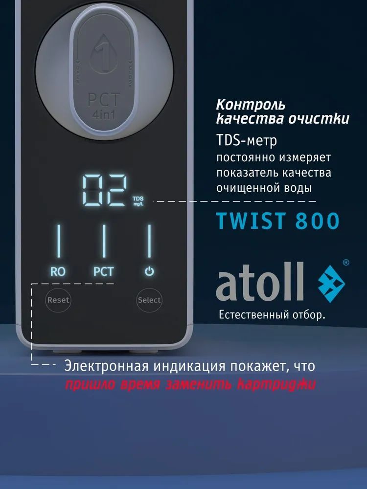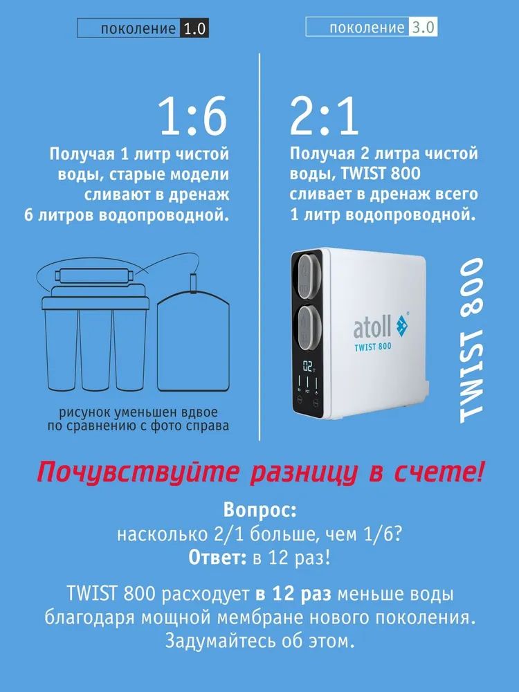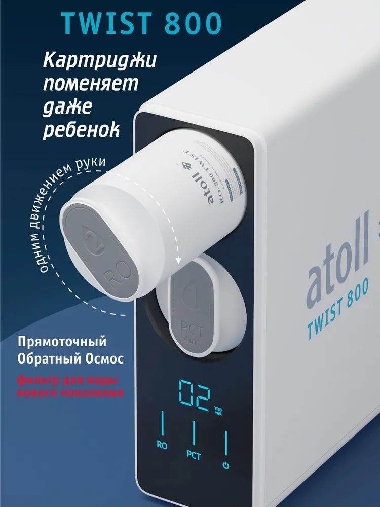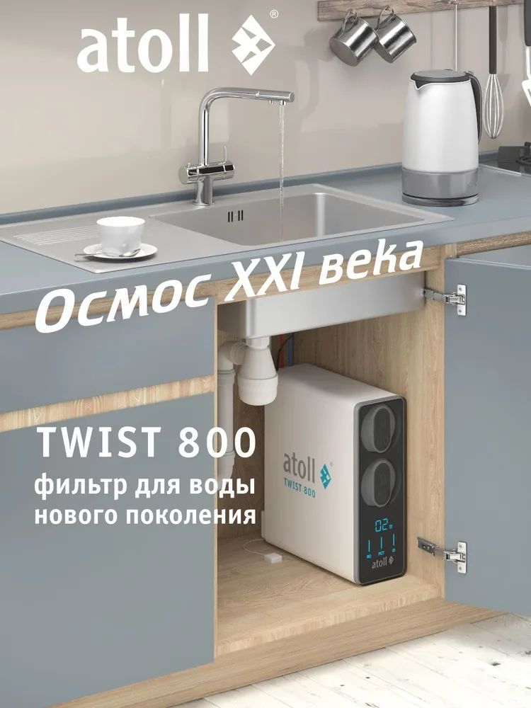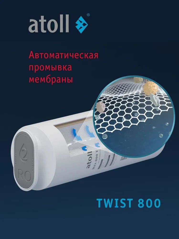 - Сверхмощная обратноосмотическая мембрана atoll 800 TWIST производит в минуту более 2-х литров чистой питьевой воды.