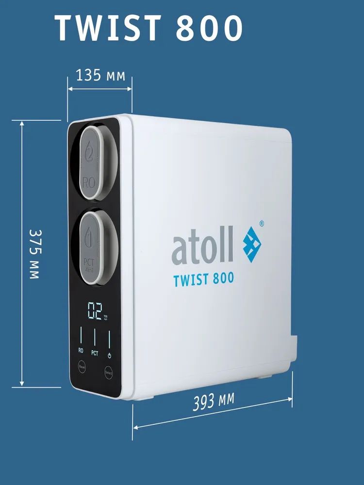 - Сверхмощная обратноосмотическая мембрана atoll 800 TWIST производит в минуту более 2-х литров чистой питьевой воды.