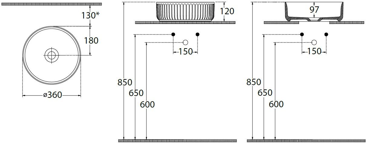 - Раковина не имеет отверстия для перелива и отсутствует готовое отверстие под смеситель, что придает ей минималистичный и современный вид.
