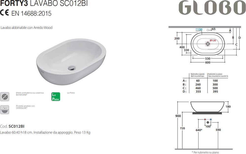 Раковина-чаша Globo Forty3 60 см SC012.BI