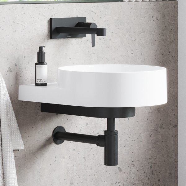 Круглый умывальник дополняется элементом дизайна в виде кронштейна белого/черного цвета или из нержавеющей стали. Магия элегантности объединяет в один тон сочетание консоли, смесителя, сифона и поддона.