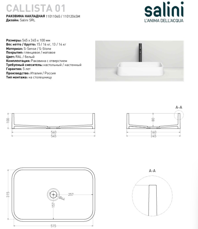 Раковина-чаша Salini Callista 01 54 см 1101204SM (S-Stone) матовая