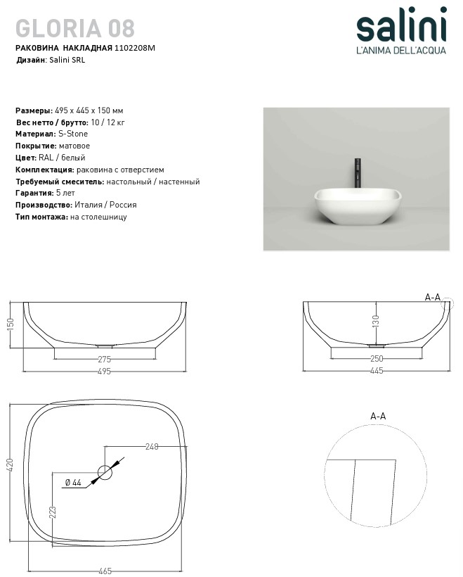 Раковина-чаша Salini Gloria 08 50 см 1102208M (S-Stone) матовая