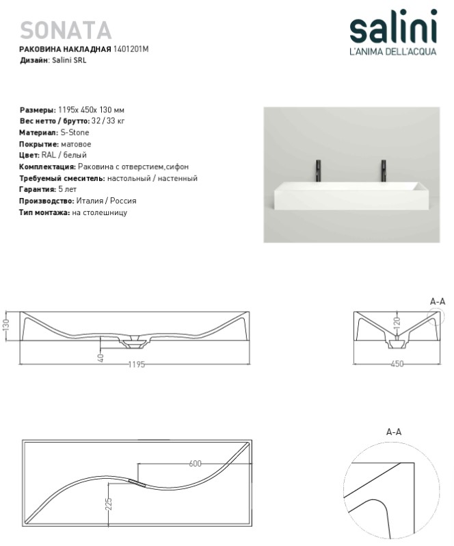 Раковина-чаша Salini Sonata 120 см 1401201M (S-Stone) матовая