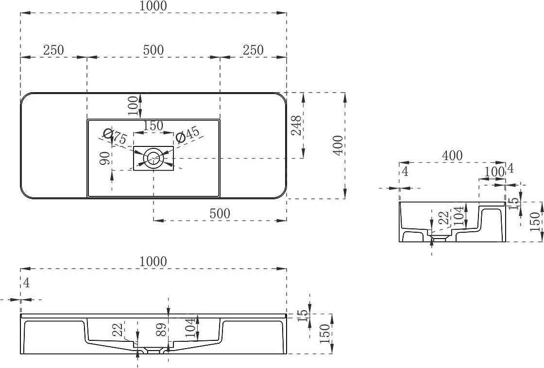 Раковина подвесная Vincea VWB-6S380MW, размер 1000x400x150 мм, цвет белый матовый.