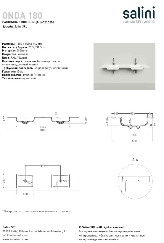 Раковина подвесная Salini Onda 180 1402202M, размер 1800x500x140 мм, цвет белый.