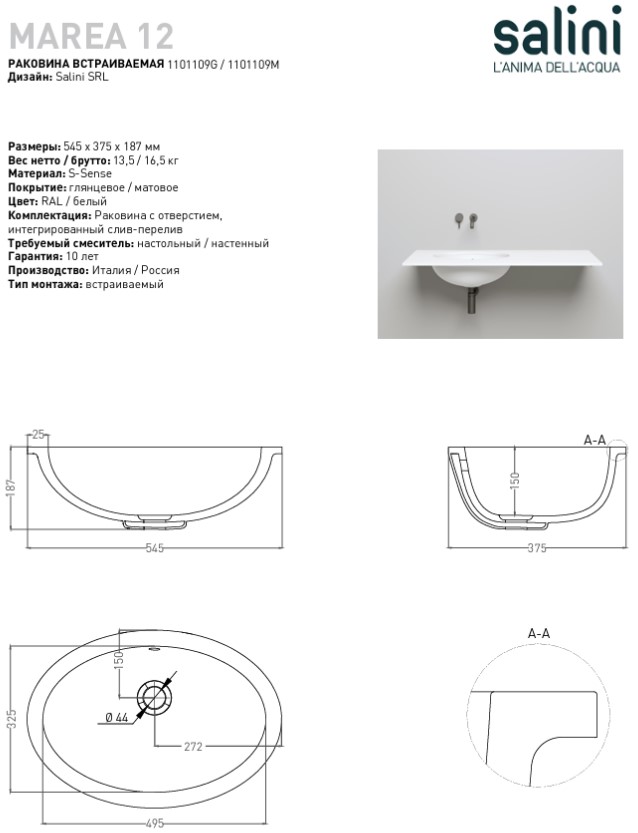 Раковина врезная под столешницу Salini Marea 12 55 см 1101109G (S-Sense) глянцевая