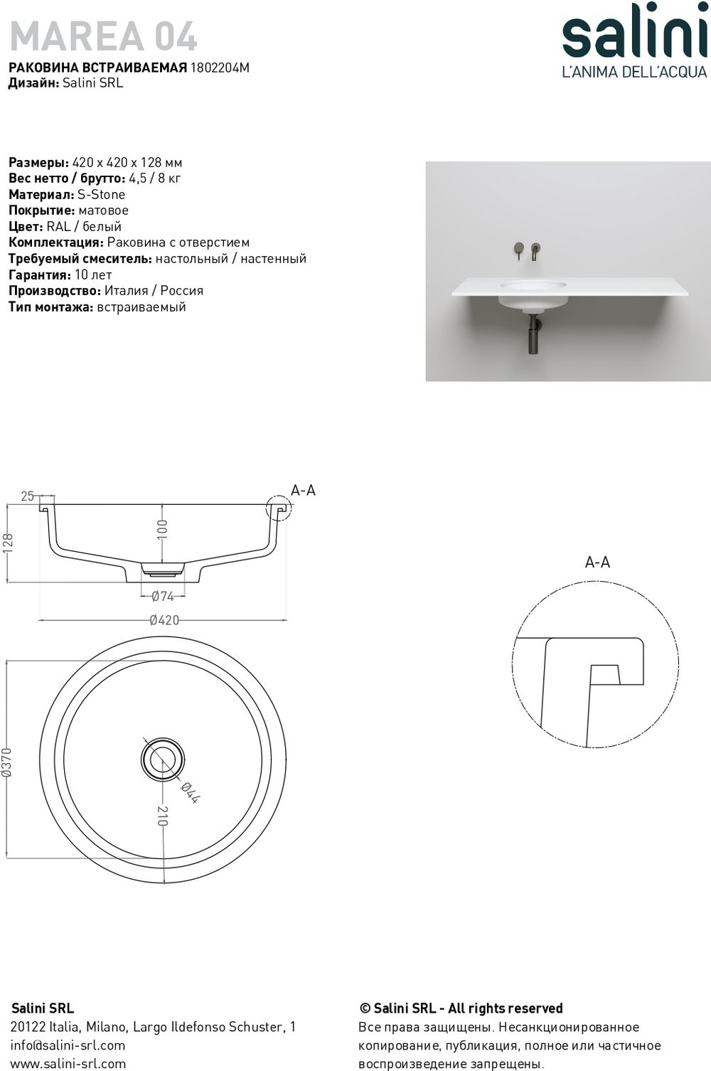 Раковина врезная под столешницу Salini Marea 04 1802204M, размер 420x420x128 мм, цвет белый.