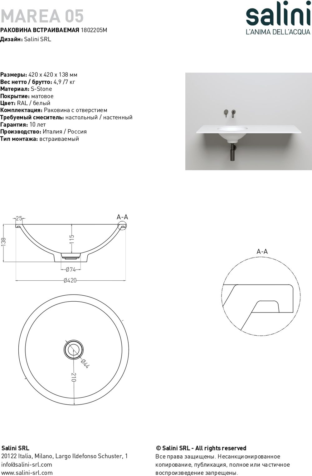 Раковина врезная под столешницу Salini Marea 05 42 см 1802205M (S-Stone) матовая
