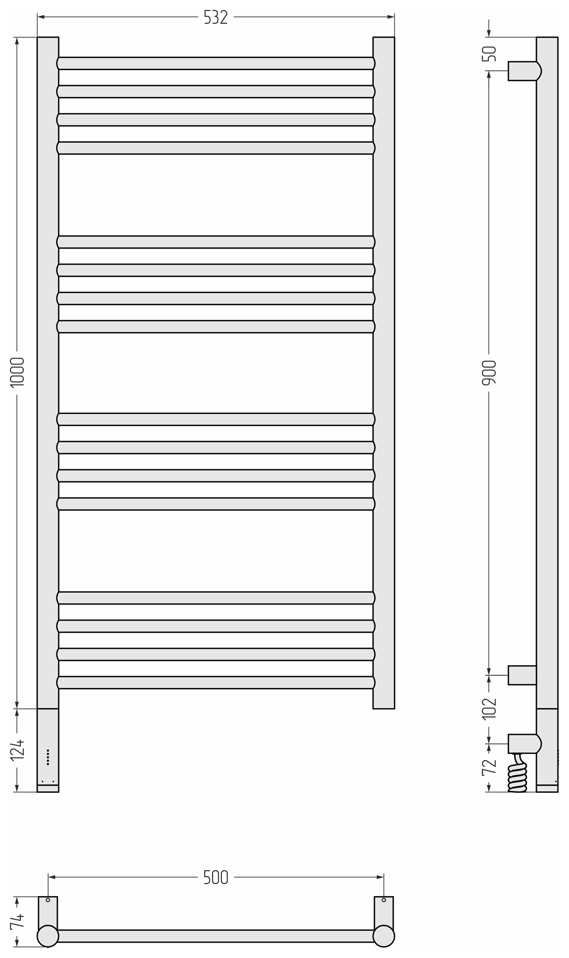 Полотенцесушитель электрический Сунержа Богема 3.1 31-6004-1050, размер 532x1124 мм, 16 перекладин, мощность 300 Вт, цвет чёрный матовый. Скрытое подключение.