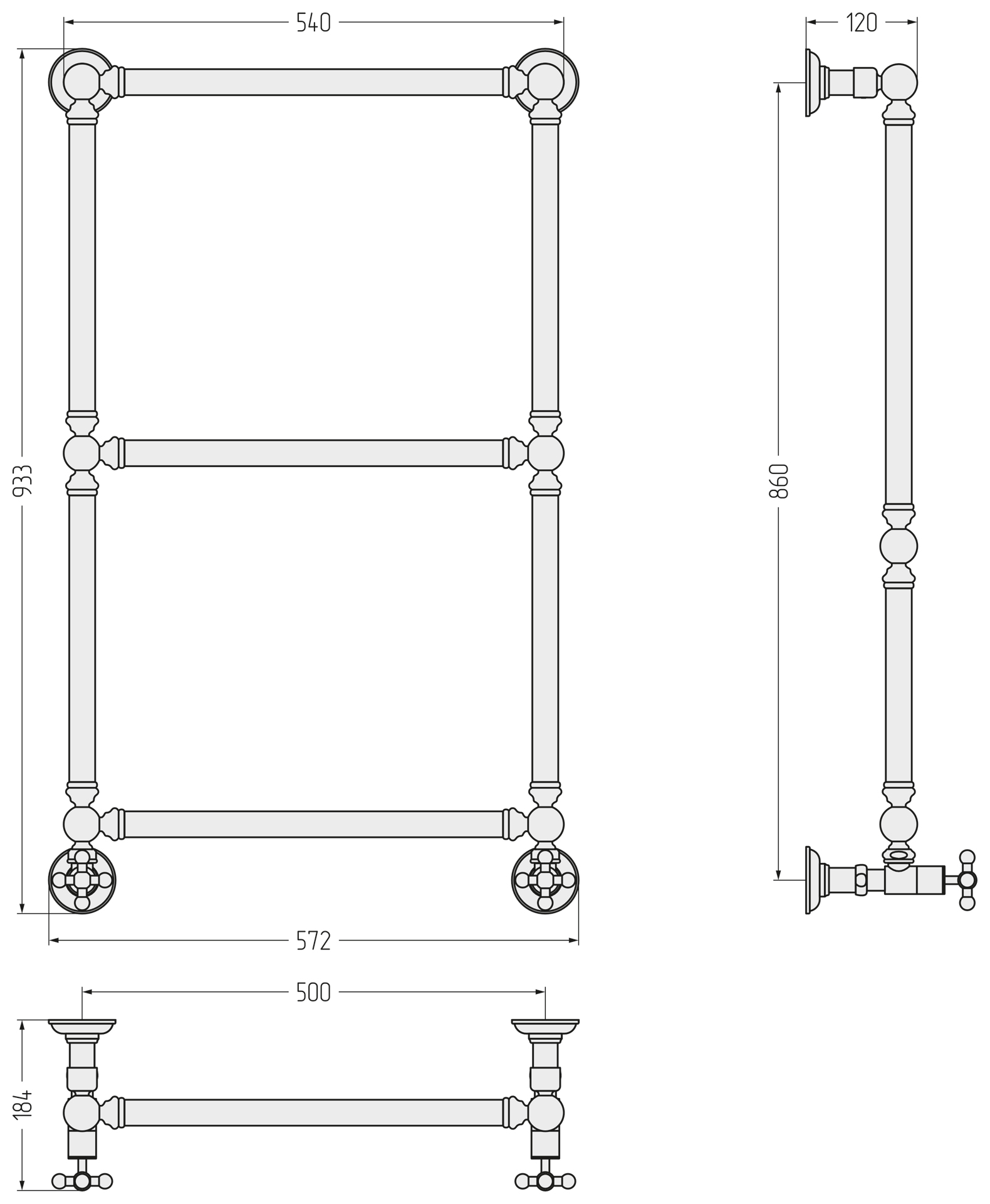 Полотенцесушитель водяной Сунержа Ренессанс 15-0280-8650, размер 572x933 мм, 3 перекладины, цвет тёмный титан муар.