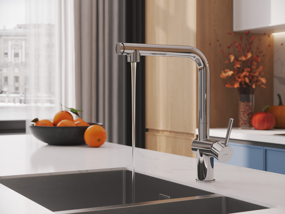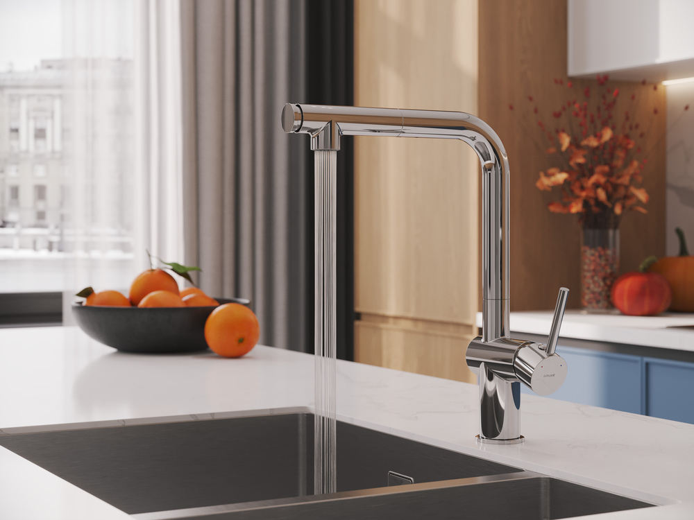 Смеситель для кухни Cersanit Flavis A64843 с выдвижным изливом, высота излива 290 мм, материал латунь, цвет хром.