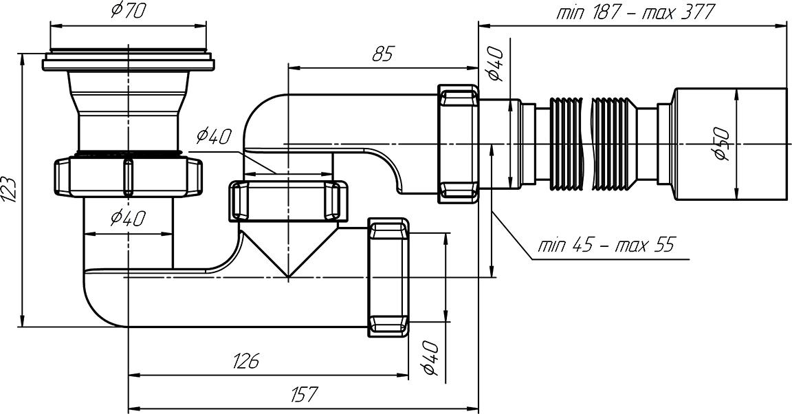 - Регулируемая конструкция позволяет настроить высоту сифона для оптимальной работы и удобства монтажа.