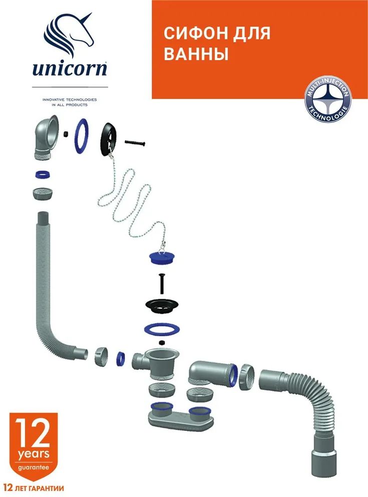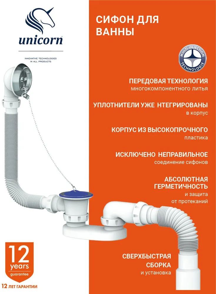 Сифон для ванны Unicorn S12 c отводом в канализацию.