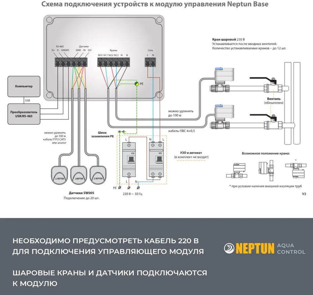 - Модуль управления: Подключение до 20 проводных датчиков и до 12 шаровых кранов
