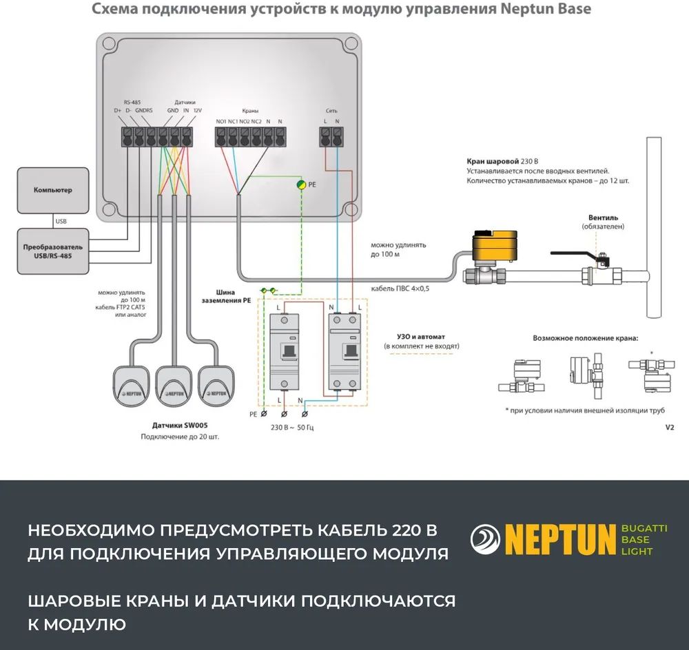 - Модуль управления: Подключение до 20 проводных датчиков и до 12 шаровых кранов