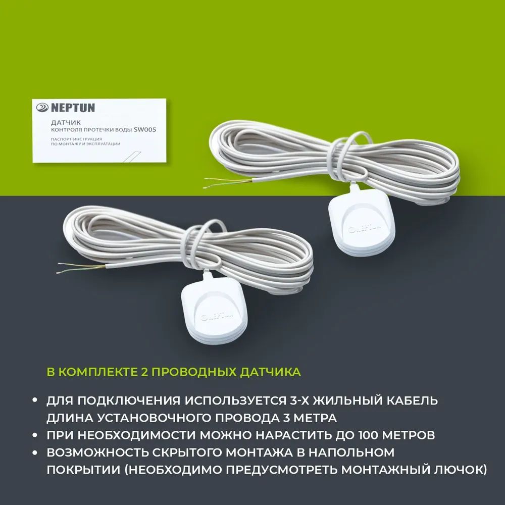 - В комплекте 2 датчика для размещения в стояке. Увеличьте число зон контроля: разместите дополнительные проводные датчики в местах, где провода не видны
