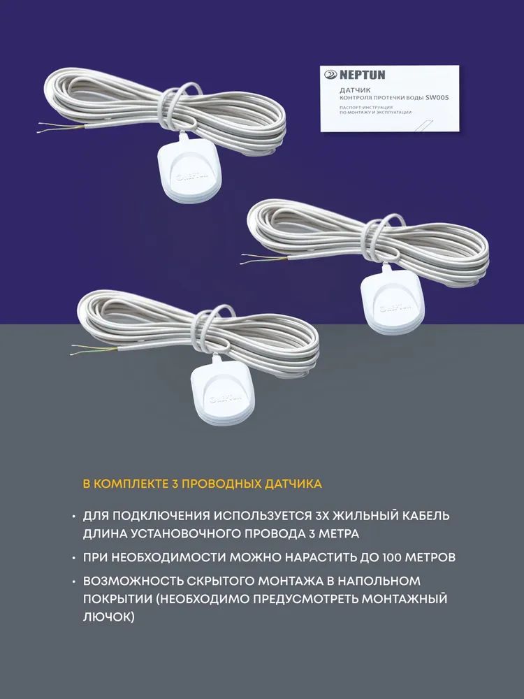 - В комплекте 3 датчика для охвата основных зон возможной протечки: ванная, туалет, кухня. Увеличьте число зон контроля, разместив дополнительные датчики в стояке, за стиральной и посудомоечной машинами