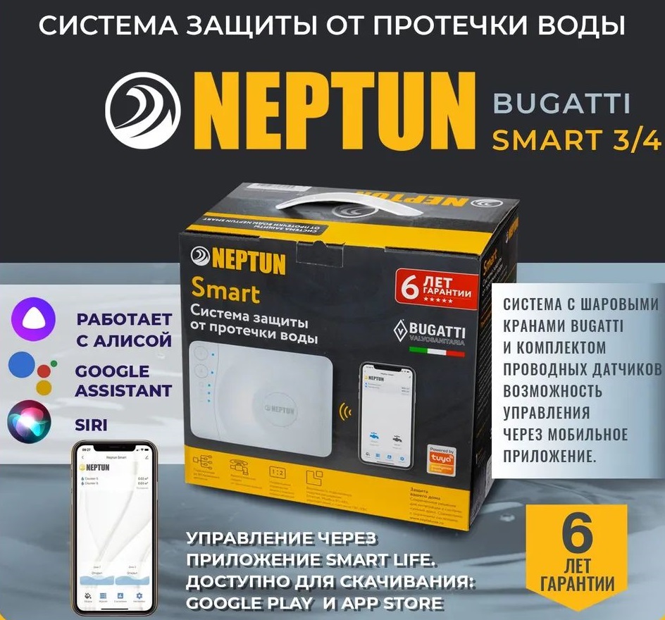 - Умная система защиты от протечки воды Neptun Bugatti Smart Tuya предназначена для обнаружения и локализации протечек воды в системах водоснабжения. Компоненты системы связаны и взаимодействуют друг с другом через центральный контроллер (модуль управления Neptun Smart Tuya), который может быть дополнительно укомплектован дополнительными платами расширения: