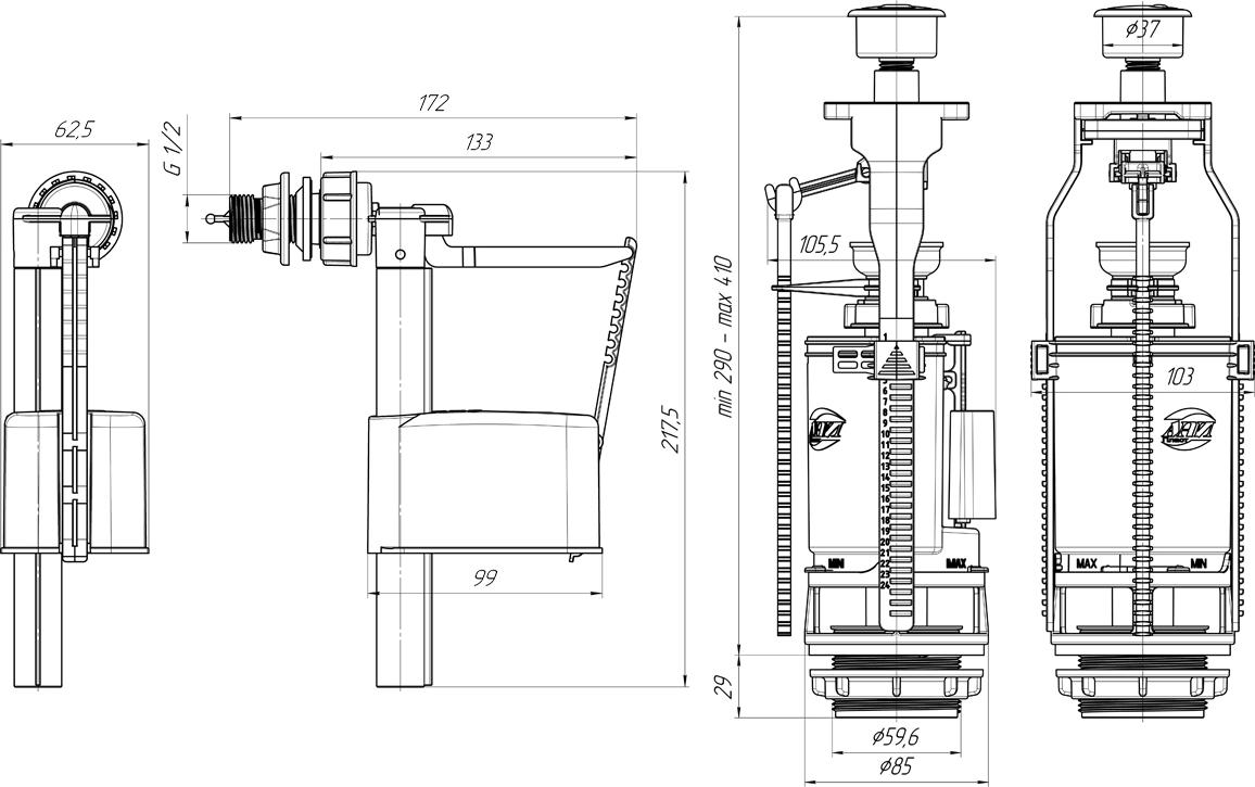 - Наливной механизм с боковой подводкой и пластиковой резьбой диаметром G 1/2". Сливной механизм с двойной металлизированной кнопкой, с двойным режимом слива. Регулировка по высоте 290-410 мм. Отверстие для кнопки слива в крышке бачка 40 мм, посадочное отверстие сливной арматуры 60 мм.