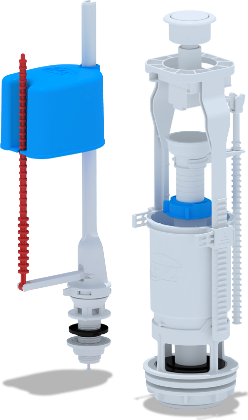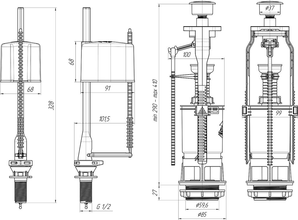 - Наливной механизм с нижней подводкой и пластиковой резьбой диаметром G 1/2, регулировка по высоте 234-328 мм.