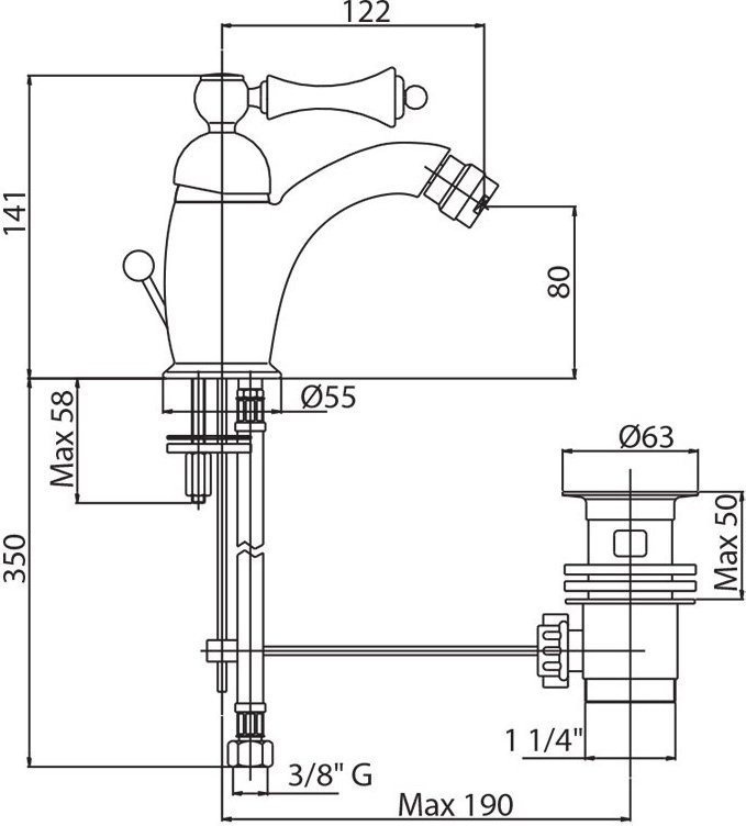 Смеситель для биде Cezares MARGOT-BSM1-01-N с донным клапаном, материал - латунь, цвет - хром, ручка - черный.
