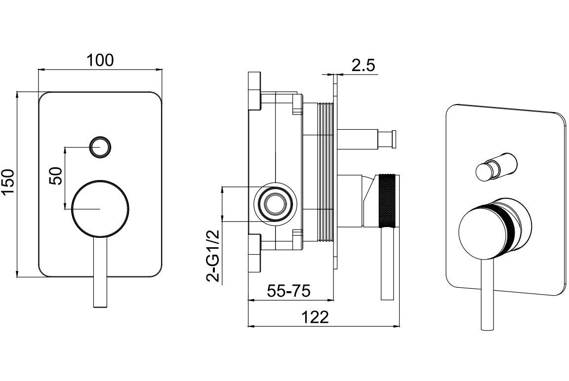 • Встраиваемый смеситель на 2а потребителя воды, дополнительно приобретается оборудование на 2а потребителя (Пример: №1 верх.душ + №2 душевой набор с водорозеткой ИЛИ другие комбинации из 2х элементов)
