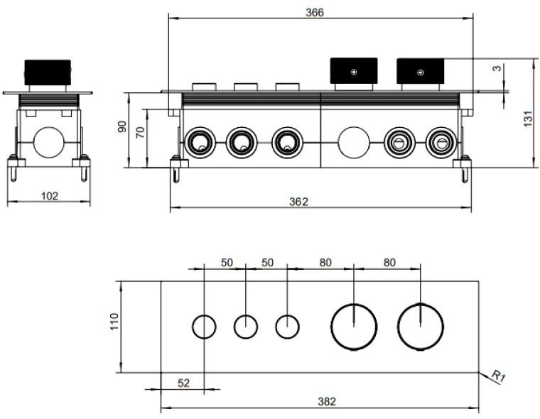 • Переключатель режимов - PUSH KEY для 3х потребителей воды, дополнительно приобретается оборудование на 3и потребителя (Пример: №1 верх.душ + №2 душевой набор с водорозеткой + №3 излив ИЛИ другие комбинации из 3х элементов)