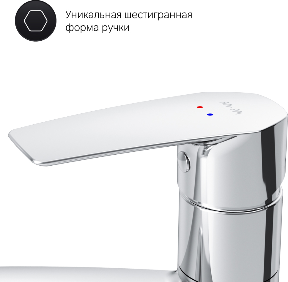 Дизайн от создателей Product Identity AM.PM - GP designpartners (Австрия). Обновление смесителей для ванной комнаты в коллекции Top-Sellerе. Брутальный и трендовый дизайн: уникальная шестигранная форма выделяется среди однообразных стандартных смесителей в доступном ценовом сегменте. Эксклюзивная разработка: специально спроектированный для АМ.РМ керамический картридж SoftMotion 35 мм обеспечивает оптимальную регулировку температуры а также позволяет выдерживать любые перепады давления. Разработан с учетом ваших потребностей и особенностей различных пространств. Высокий излив смесителя для кухни Gem идеально подойдет для любой раковины поможет вам с легкостью справится с такими задачами как наполнение больших емкостей.