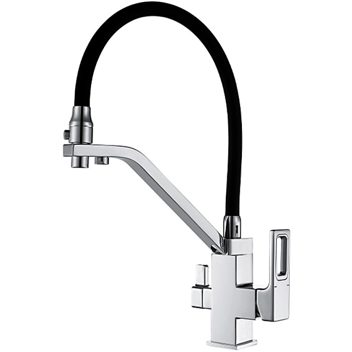 Смеситель Gappo G4318 с гибким изливом на две воды. Корпус сделан из латуни, а гусак из силикона. Металл не будет ржаветь, также он очень прочный. Силиконовый излив гнется во все стороны, но при этом он не ломкий. Касательно выхода питьевой воды, то потоки не смешиваются и она всегда будет чистой. Достигается это благодаря фильтру обратного осмоса. Установленный аэратор предотвращает распространение брызг. Для регулировки воды используется керамический картридж.