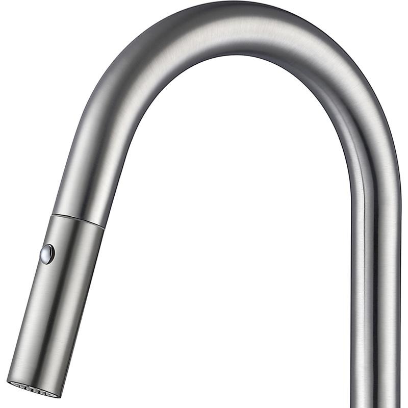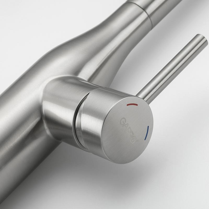 Главная особенность смесителя для кухни Gappo G4398-45 состоит в том, что у него в конструкции предусмотрена выдвижная лейка с режимом душ. С таким смесителем будет удобно наполнять большие емкости, мыть крупную посуду, овощи и фрукты. Чтобы переключаться между режимами на аэраторе есть специальная кнопка. Корпус из нержавеющей стали, цветовой оттенок сатин.