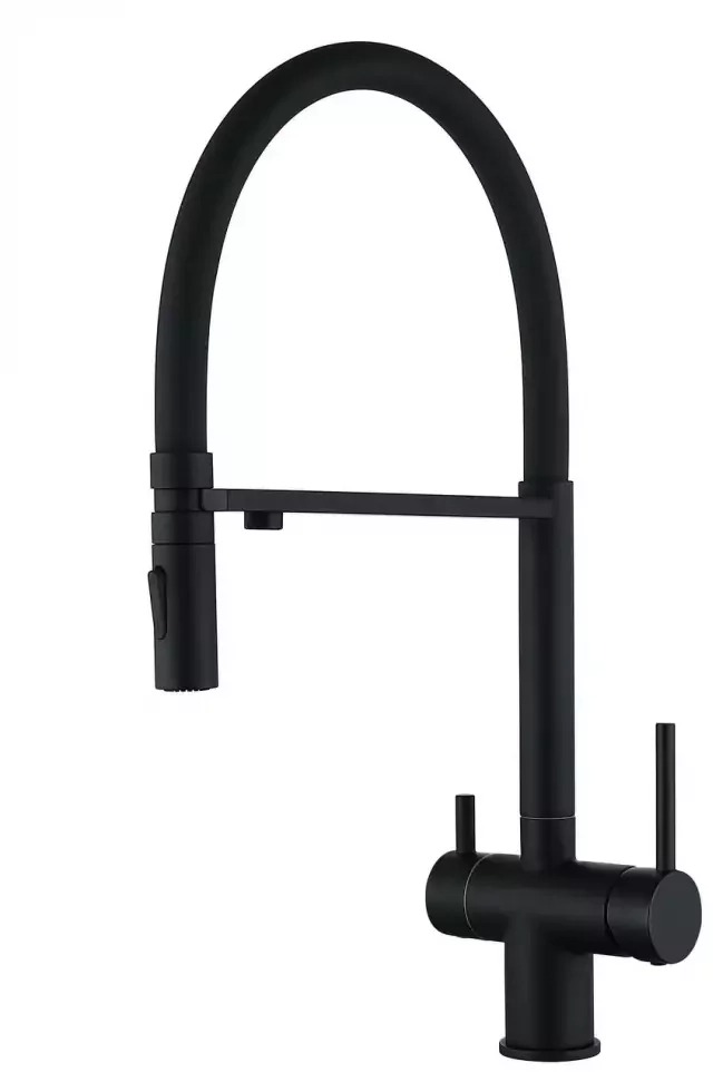 Смеситель для кухни Grocenberg GB4096BL с гибким изливом и подключением к фильтру питьевой воды, материал - латунь, цвет - чёрный матовый.
