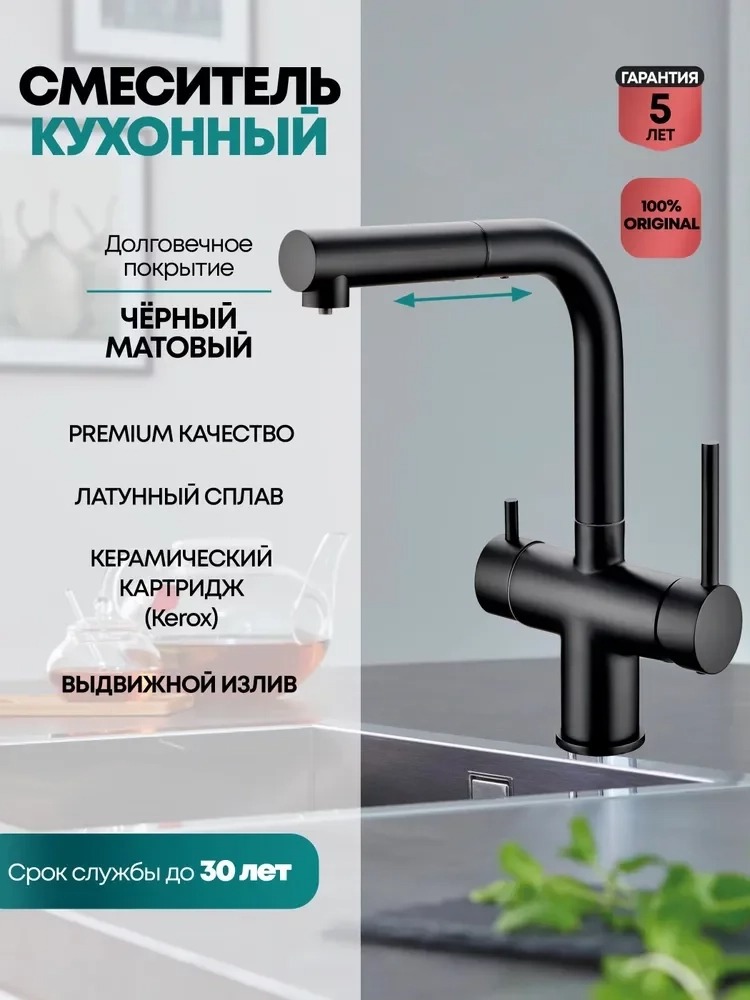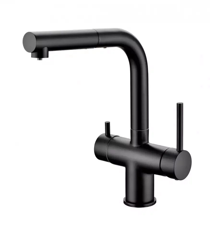 Смеситель для кухни Grocenberg GB4097BL с выдвижным изливом и подключением к фильтру питьевой воды, материал латунь, цвет - чёрный матовый.