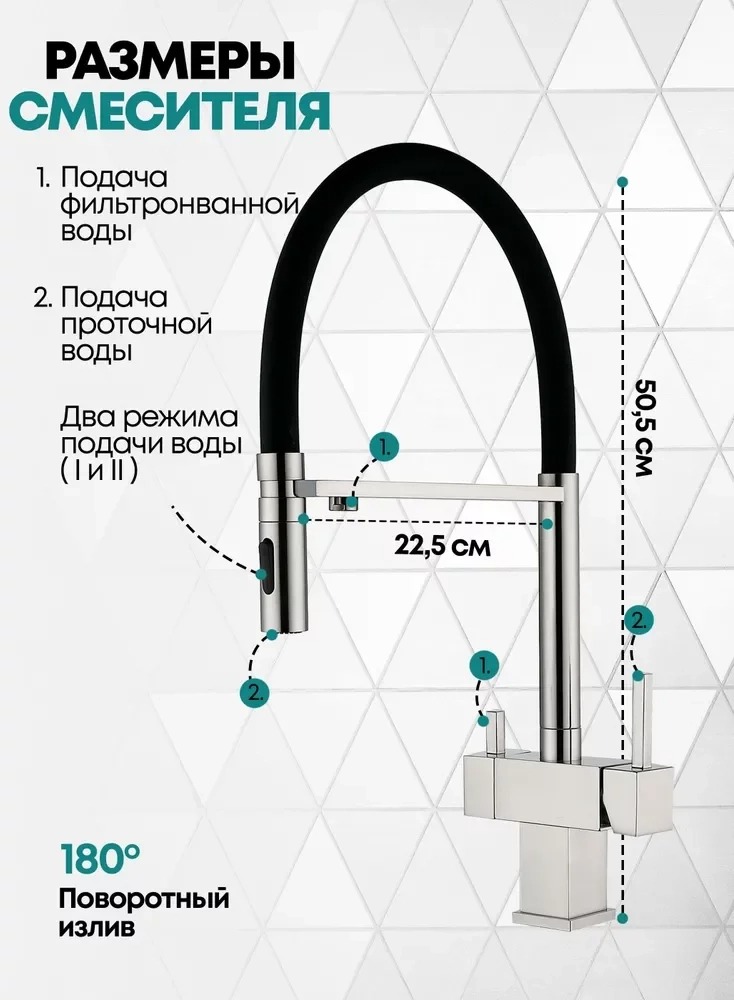 - Смеситель с подключением к фильтру и двумя режимами лейки.