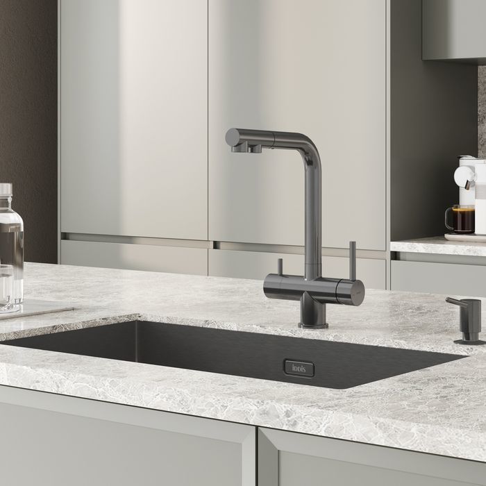 Смеситель для кухни Iddis Umbra UMBGMPFi05 с выдвижным изливом и подключением питьевой воды, материал латунь, цвет графит матовый.