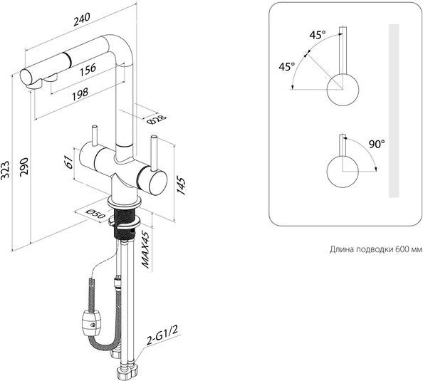 - Удобное управление водопроводной и фильтрованной водой с помощью двух отдельных ручек.