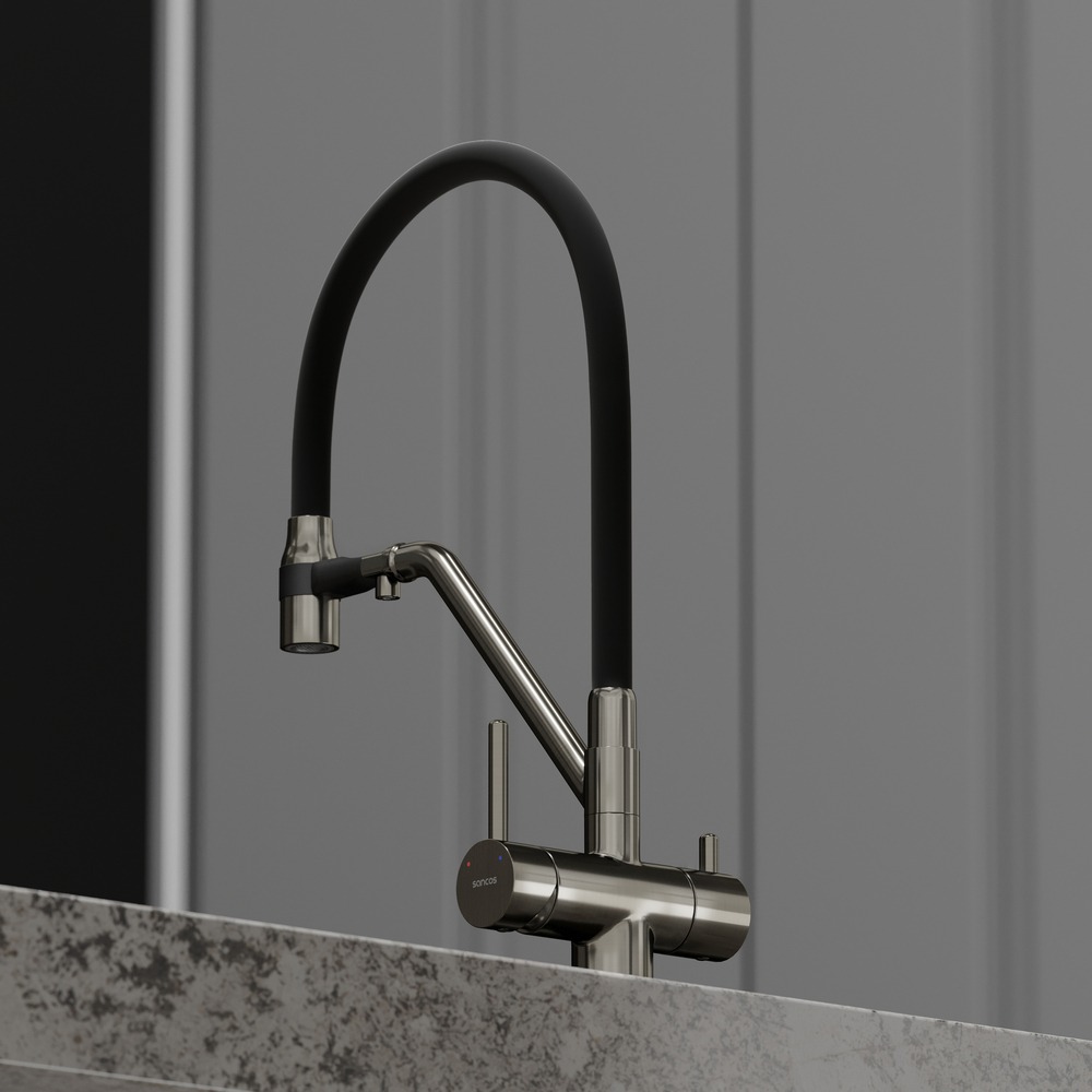 Смеситель для кухни Sancos Dora SC4003GG с гибким, поворотным изливом и подключением фильтра питьевой воды , материал - латунь, цвет - вороненая сталь/чёрный.