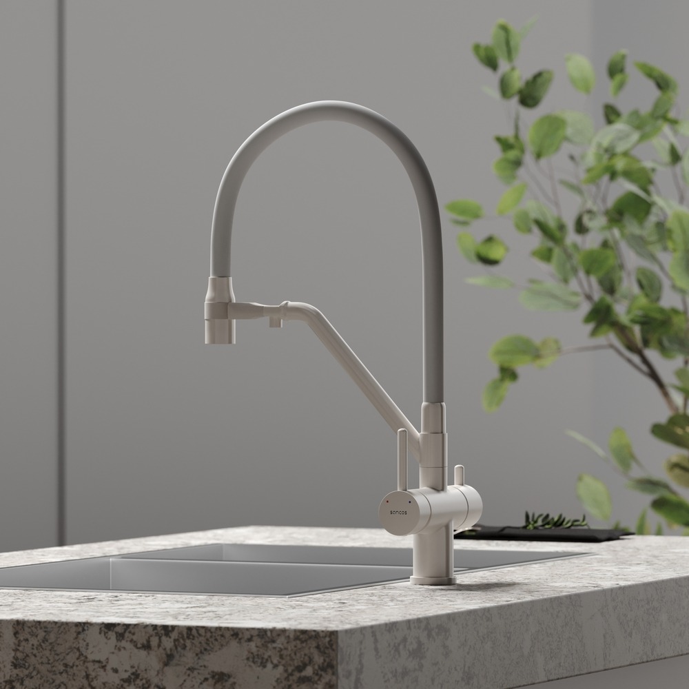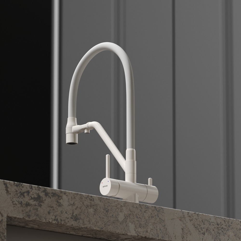 Смеситель для кухни Sancos Dora SC4003MW с гибким, поворотным изливом и подключением фильтра питьевой воды , материал - латунь, цвет - матовый белый/белый.