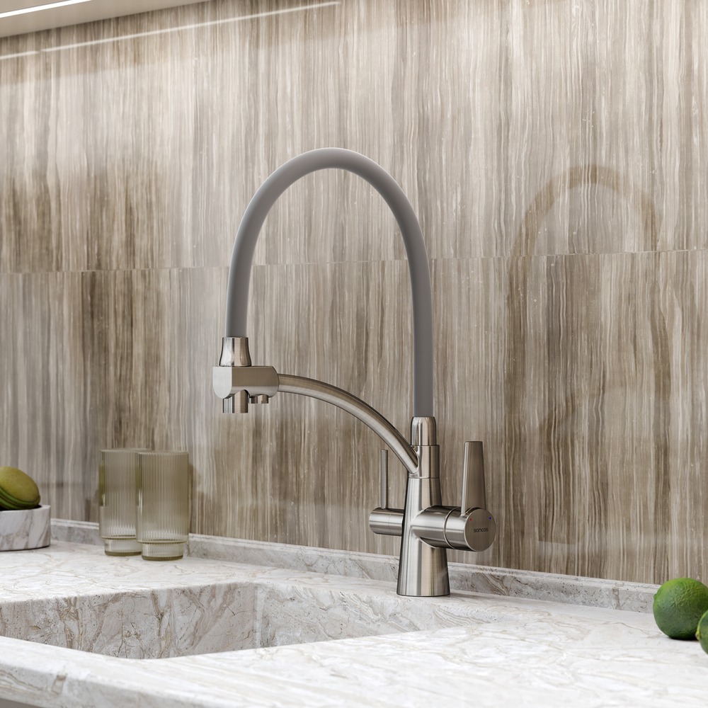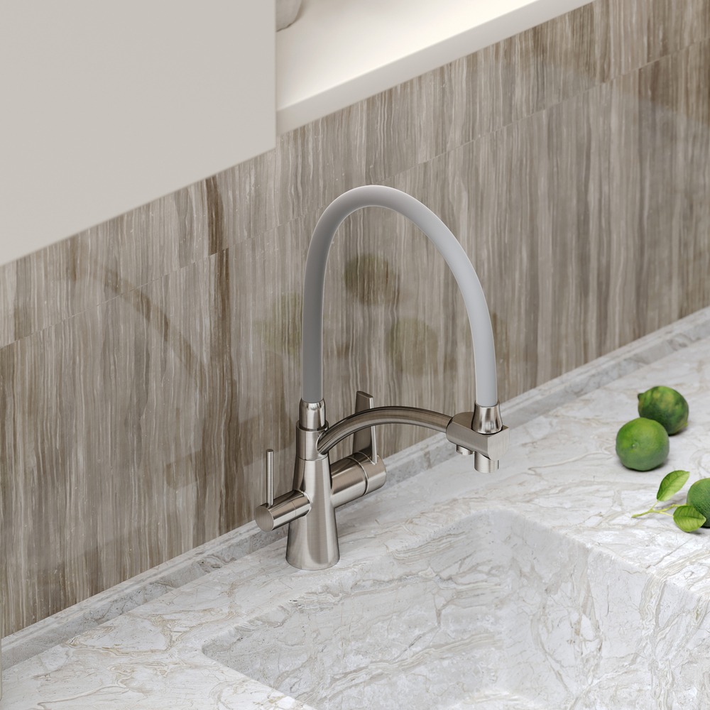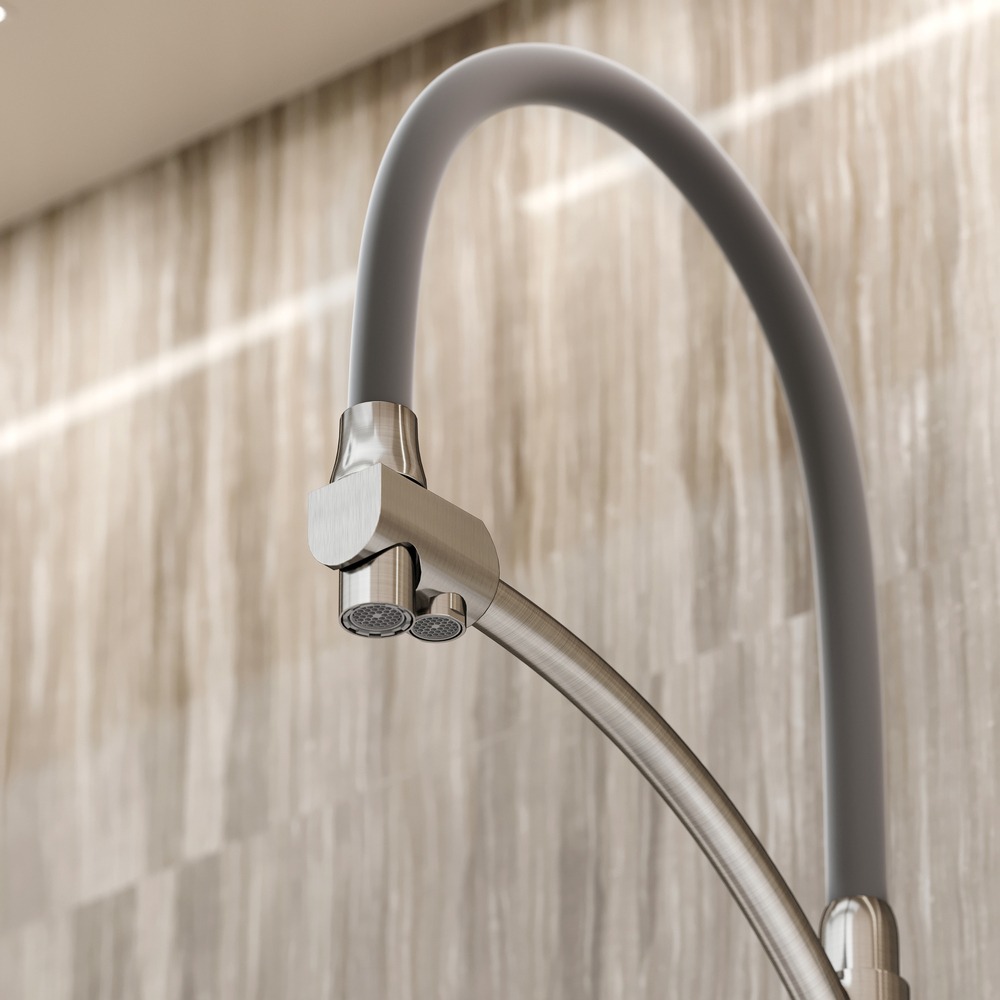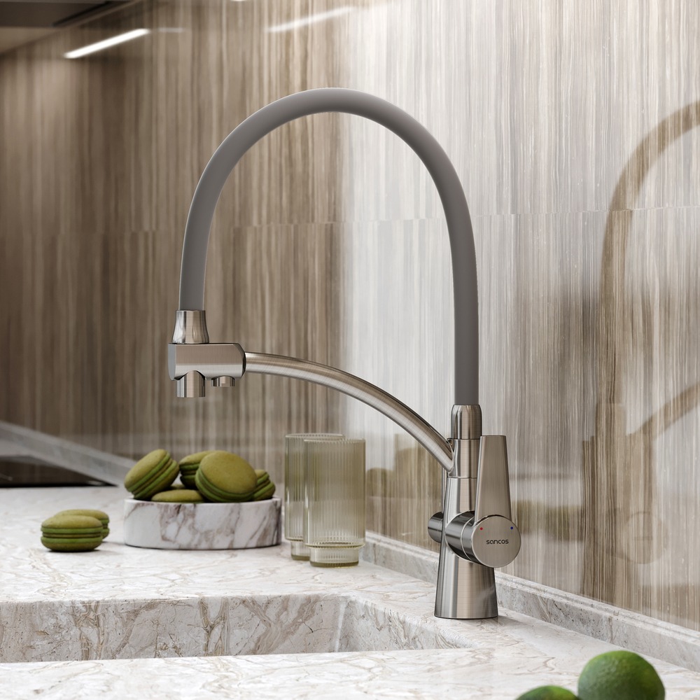 Смеситель для кухни Sancos Eri SC4001BN с гибким, поворотным изливом и подключением фильтра питьевой воды , материал - латунь, цвет - никель/серый.