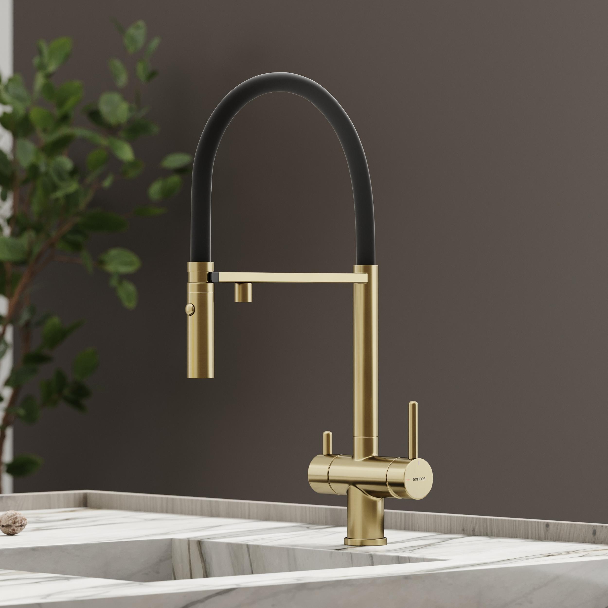 Смеситель для кухни Sancos Imola SC4010BGbh с гибким, поворотным изливом и подключением фильтра питьевой воды, материал - латунь, цвет - брашированное золото.