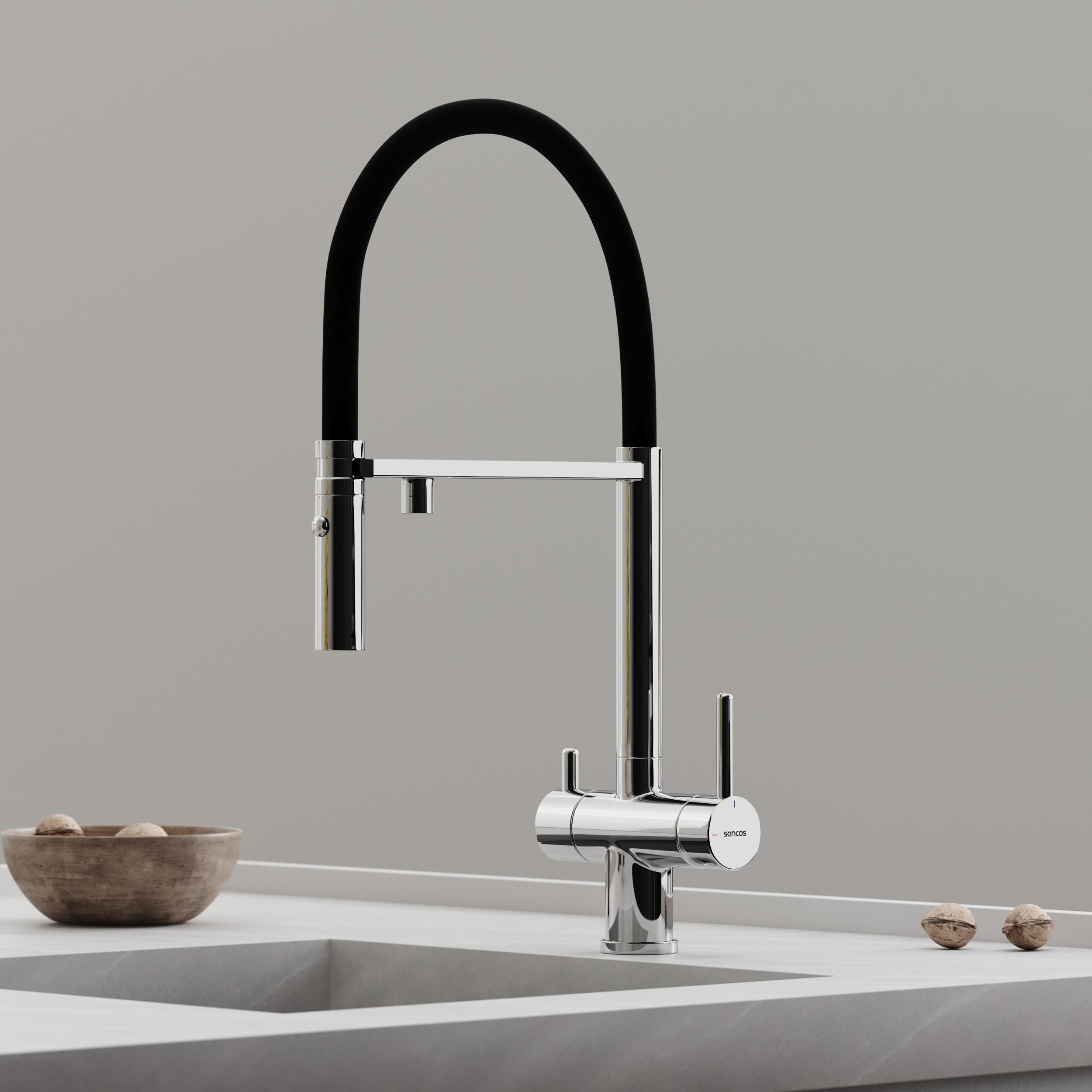 Смеситель для кухни Sancos Imola SC4010CH с гибким, поворотным изливом и подключением фильтра питьевой воды, материал - латунь, цвет - хром/чёрный.