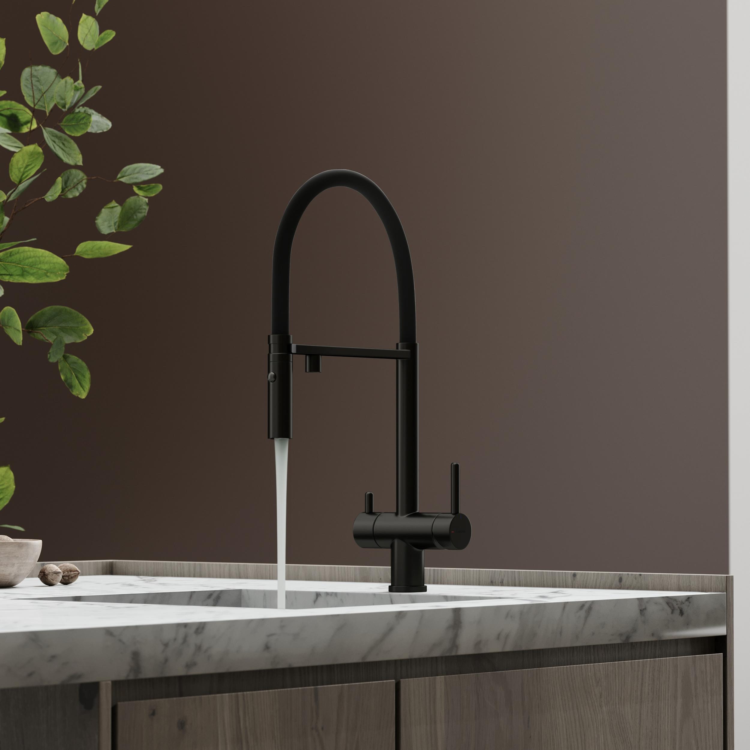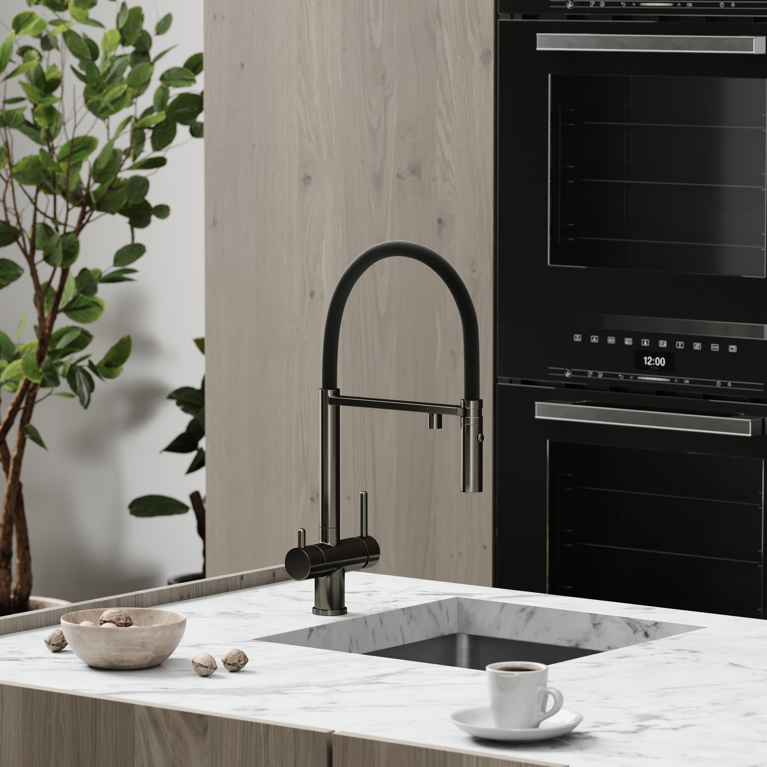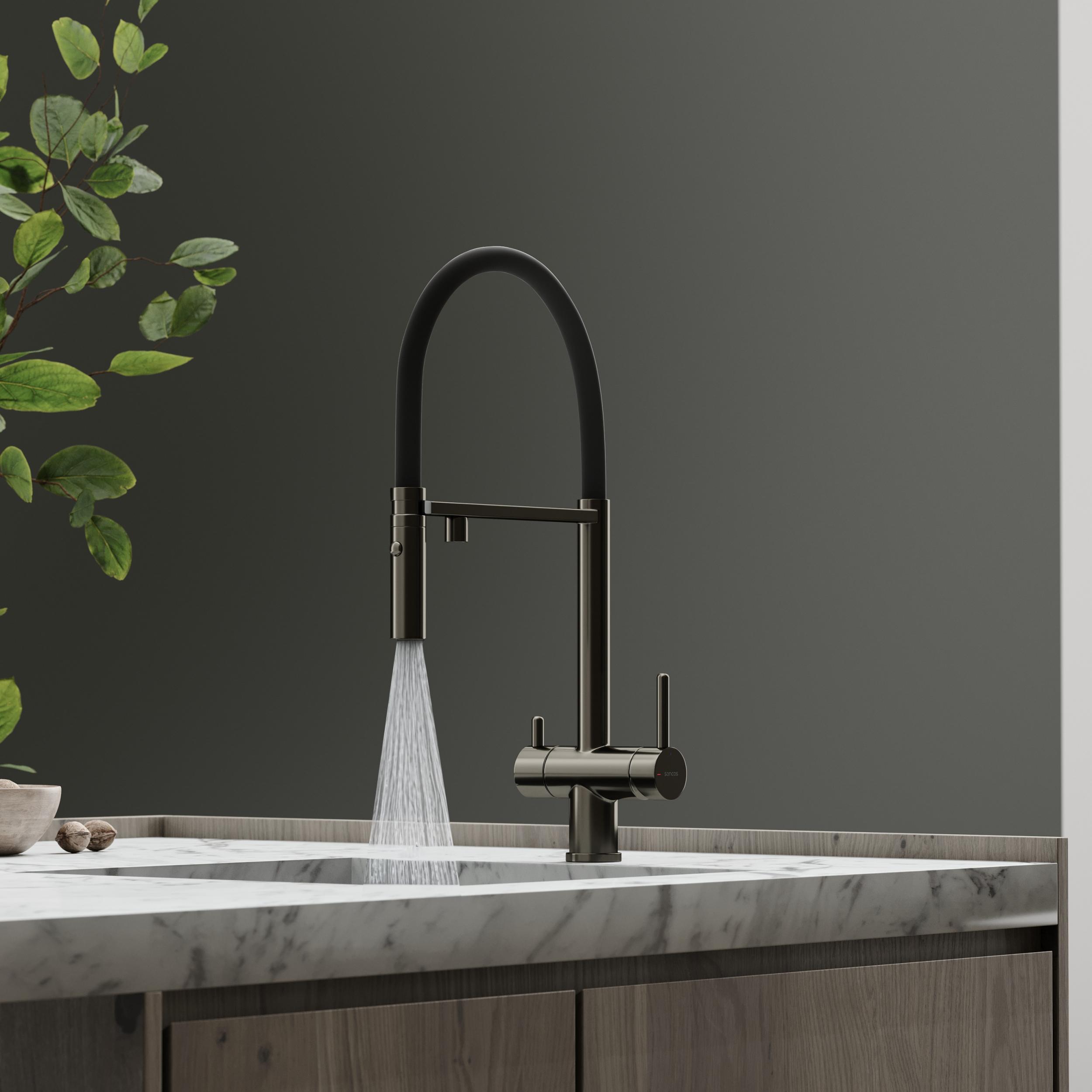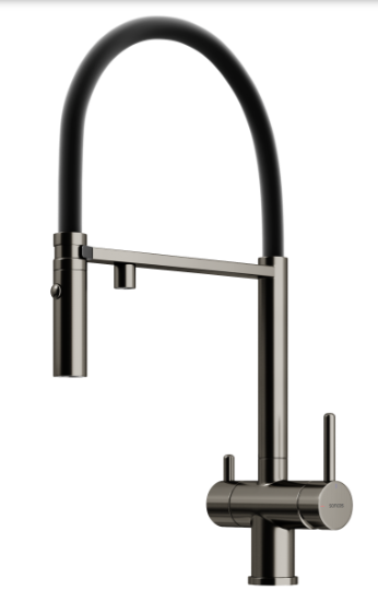 Смеситель для кухни Sancos Imola SC4010GG с гибким, поворотным изливом и подключением фильтра питьевой воды, материал - латунь, цвет - вороненая сталь/чёрный.