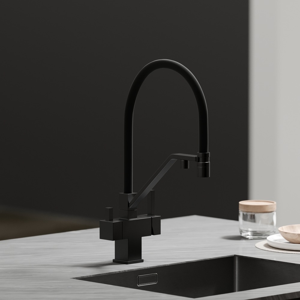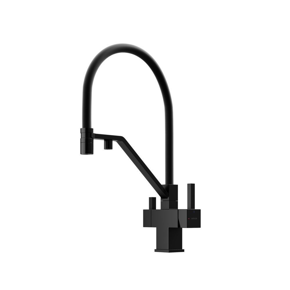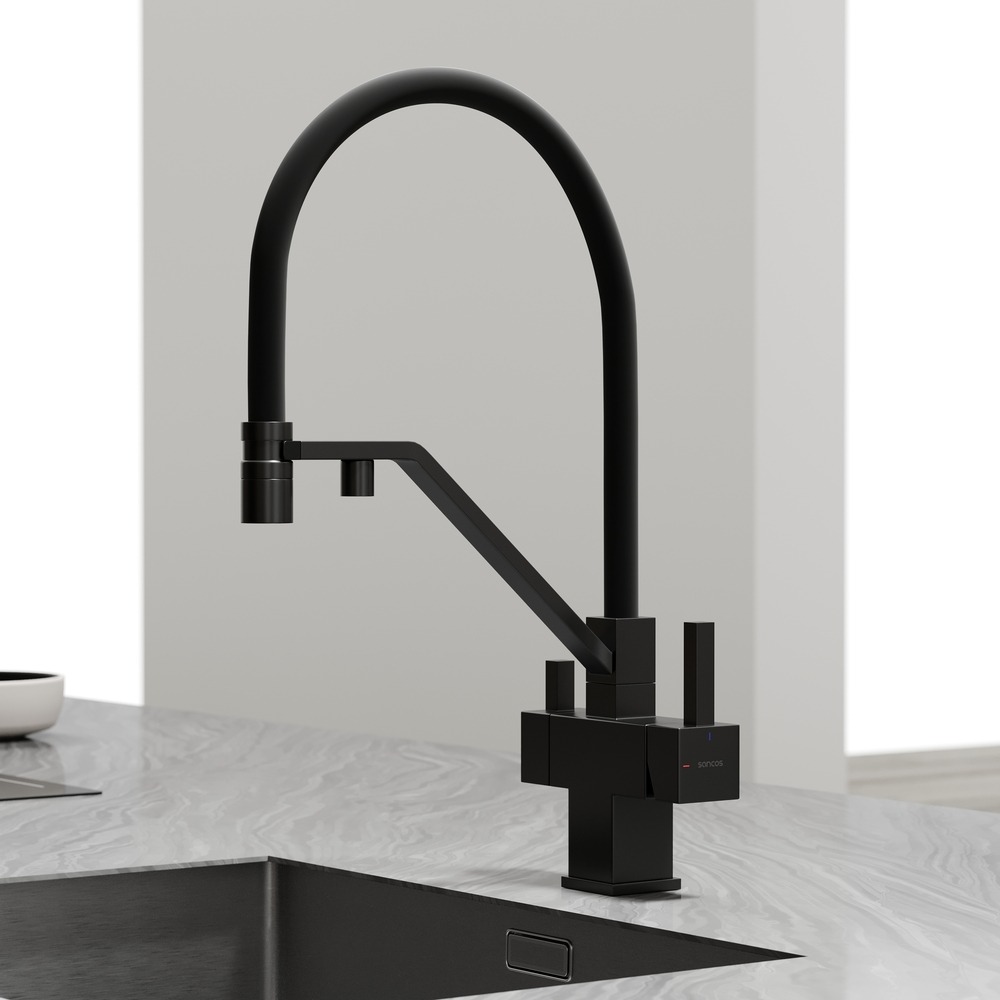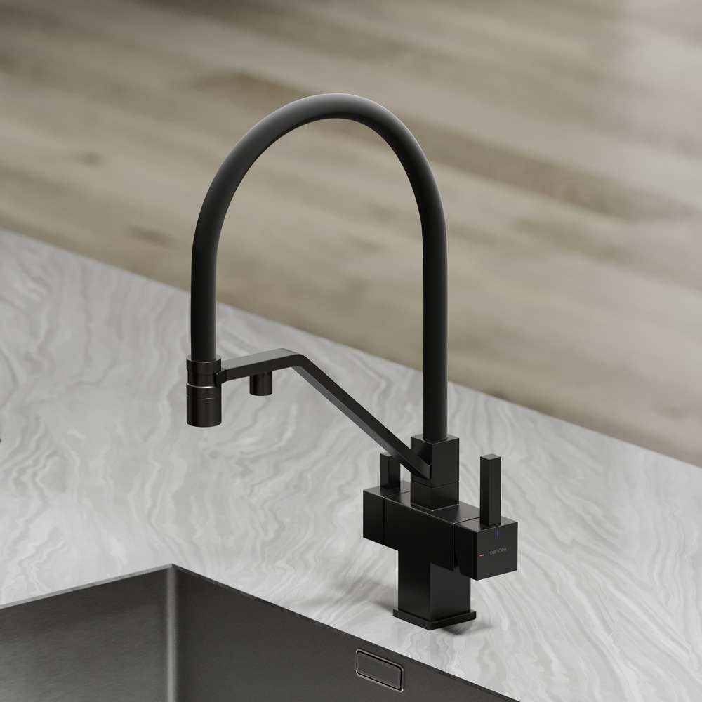 Смеситель для кухни Sancos Loro SC4007MB с гибким, поворотным изливом и подключением фильтра питьевой воды, материал - латунь, цвет - чёрный матовый/чёрный.