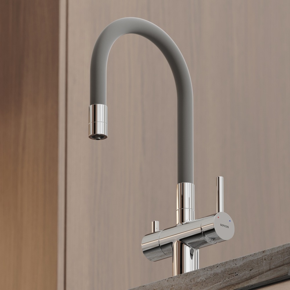 Смеситель для кухни Sancos Lucia SC4004CH с гибким, поворотным изливом и подключением фильтра питьевой воды , материал - латунь, цвет - хром/серый.